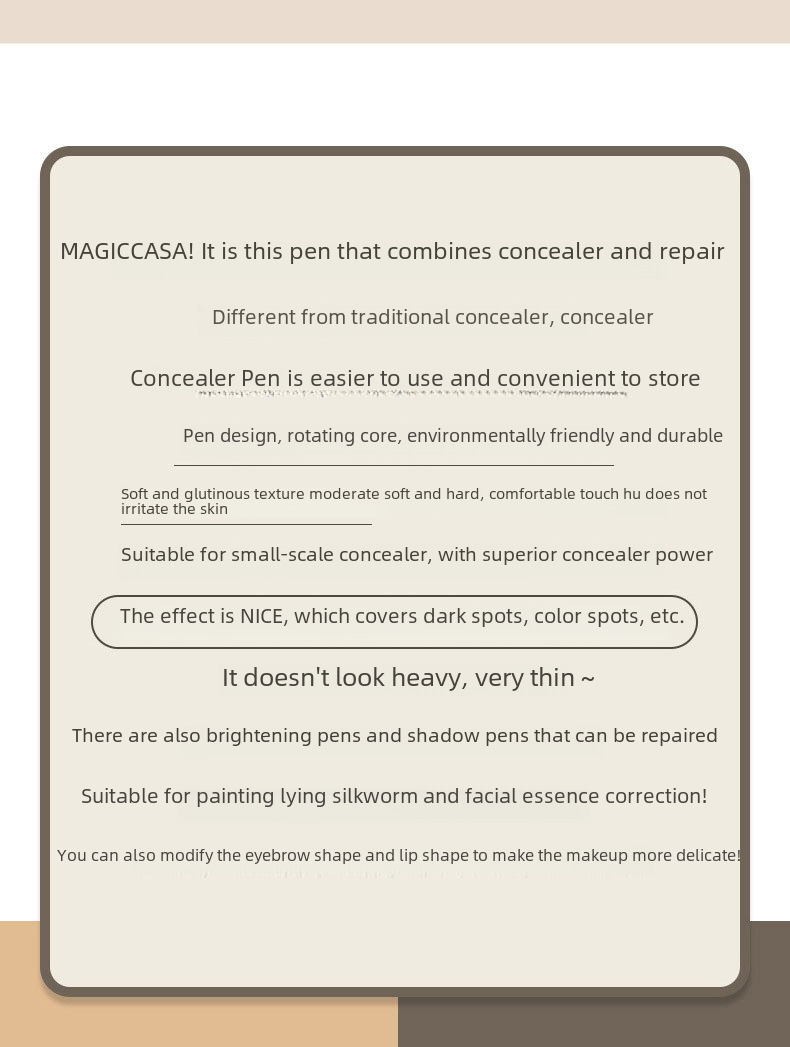 | Time to market : 2017,Face,01# white color,02# natural color,03# Gray Brown,ebay,Amazon,wish,AliExpress,Independent Station,LAZADA,Africa,Southeast Asia,North America,Northeast Asia,Yes,Yes,Domestic brand,Zhejiang G makeup net preparation word 2016011046,No,Concealer pen, concealer,MAGIC CASA,Ivory White,Normal Specifications,No,MC005,China,3 years,General,Concealer,Modifications,Uniform skin tone |