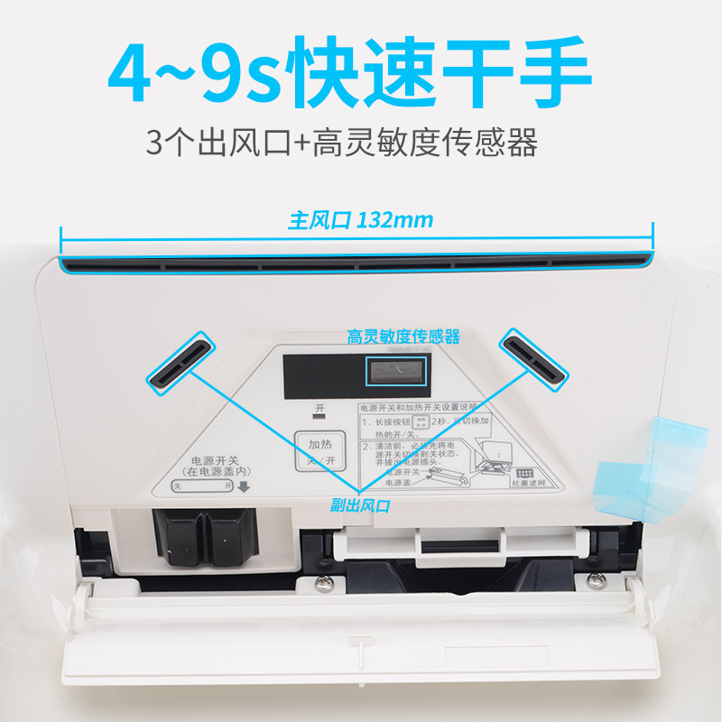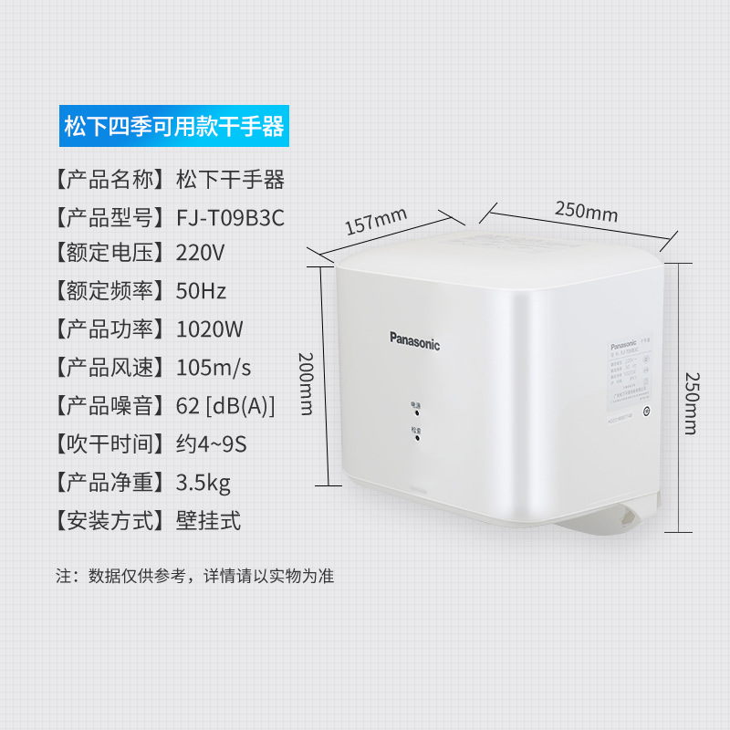 | Brand : Panasonic/Panasonic,FJ-T09B3C,FJ-T09B3C,Blow type,220,1000,50,Home delivery,ABS,Wall-hanging type,250*250*157,4,Without water tray,National Joint Insurance,5,White,No,Hand dryer |