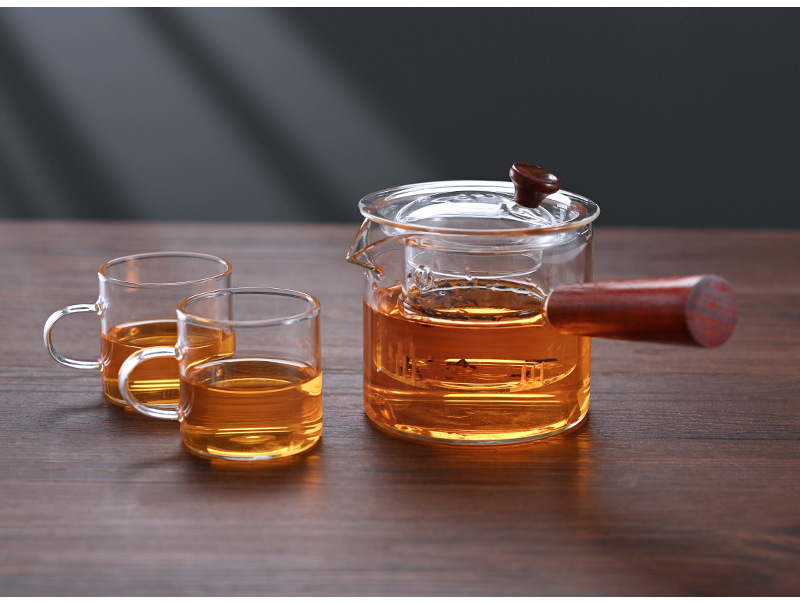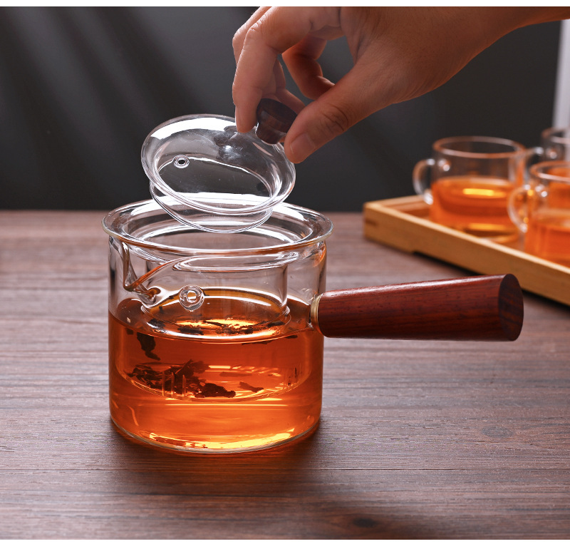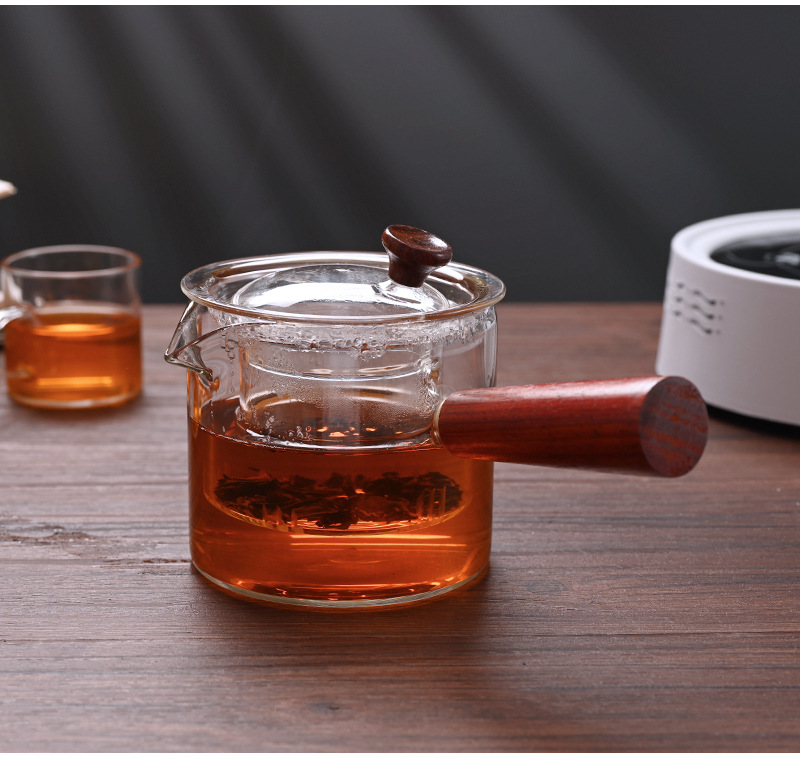 Spot sale High Borosilicate Glass boiling Teapot side handle pot steaming teapot side wooden handle with tea drain tea set intuitive pot
